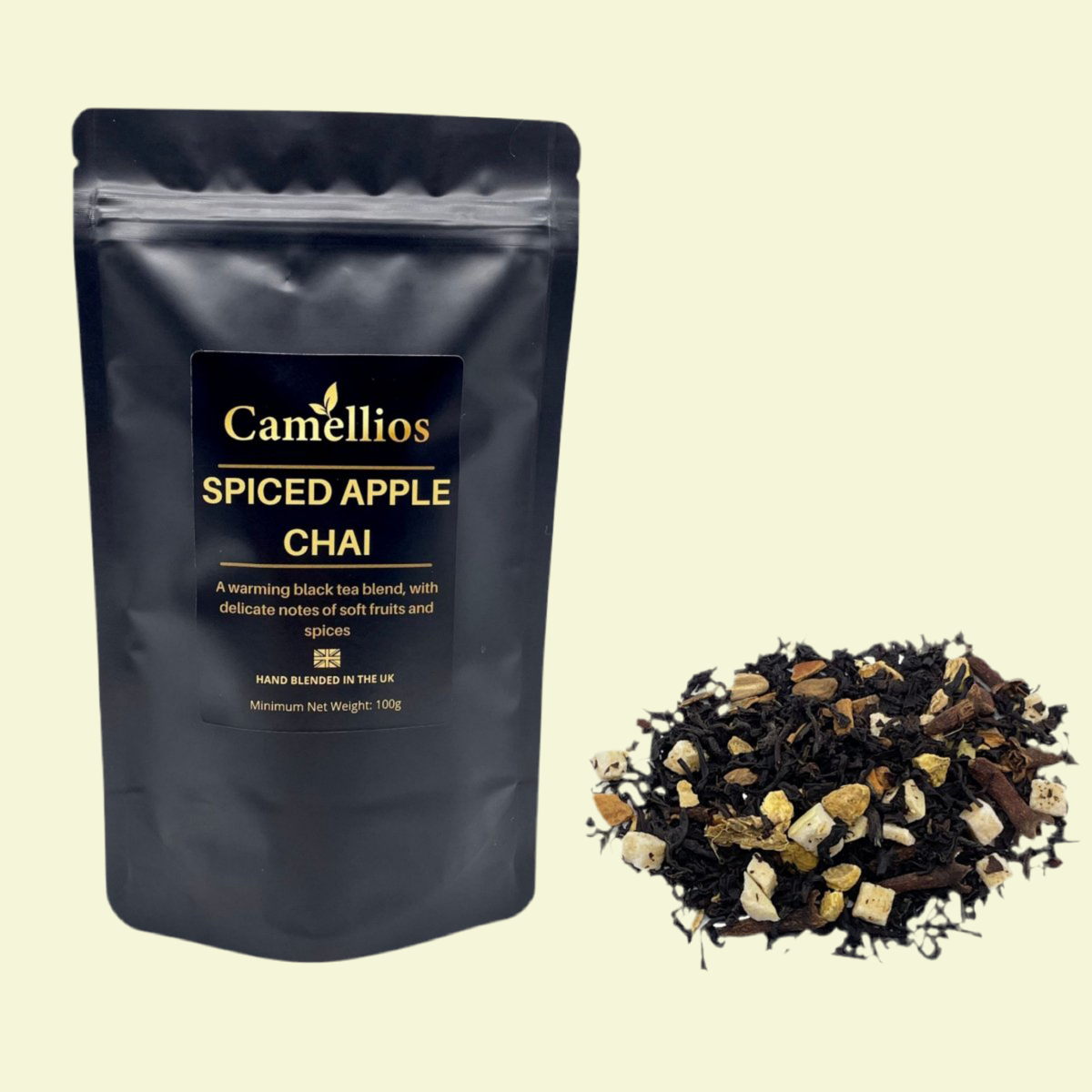 SPICED APPLE CHAI: A warming black tea blend, with delicate notes of soft fruits and spices.