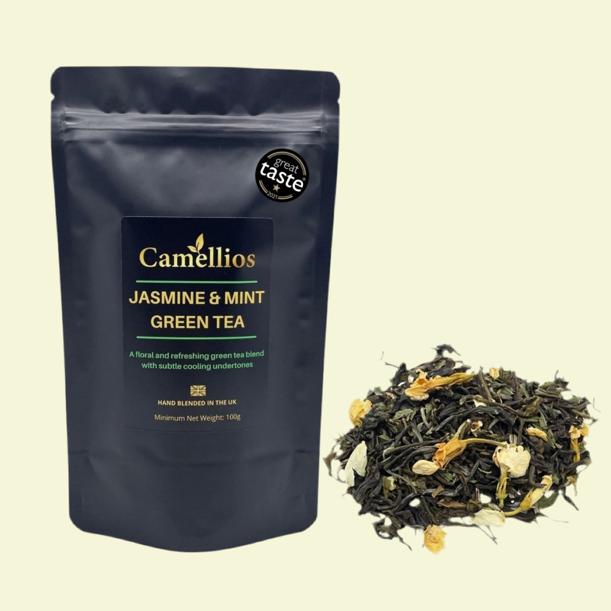 JASMINE AND MINT GREEN TEA: A floral and refreshing green tea blend with subtle cooling undertones.